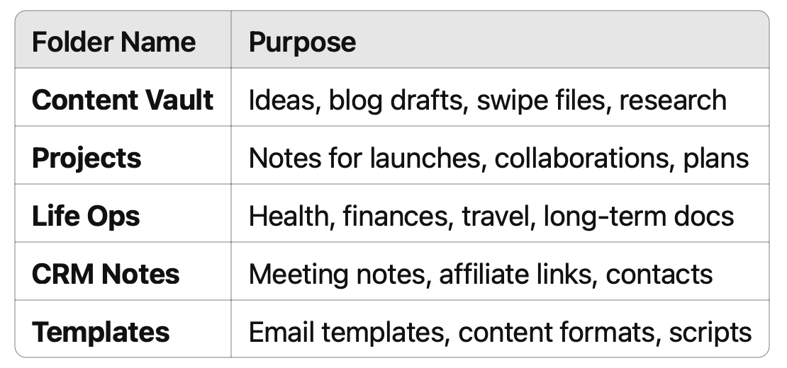 Think: writing space, idea hub, content bank, SOPs, reference docs.