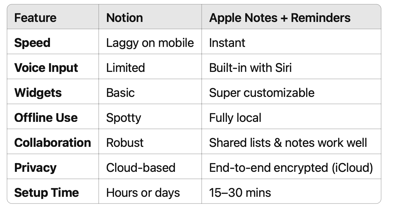 Let’s see how to combine Apple Notes + Reminders into a Notion substitute, with zero lag, little setup, and 100% focus on actually doing the thing.