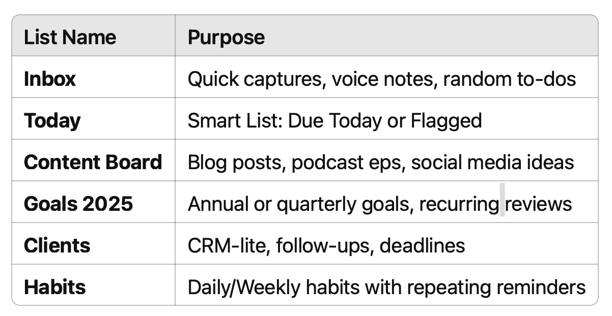 Think: goals, deadlines, repeating habits, smart list filters, project pipelines.