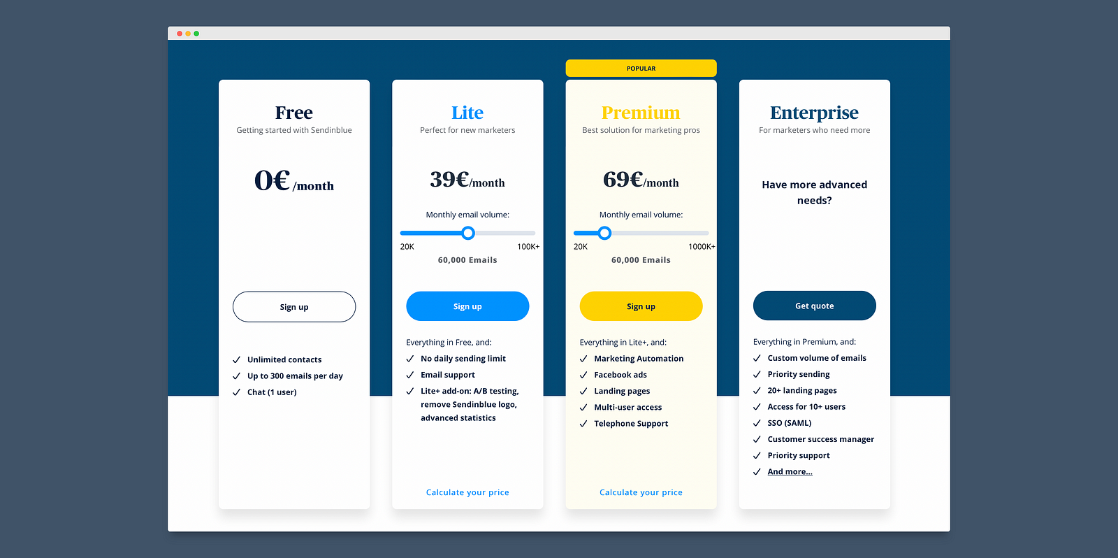 For 60,000 monthly mails (compared to 50,000 on EmailOctopus) you pay $39 per month on Sendinblue’s lite plan or $69 on the premium plan.
