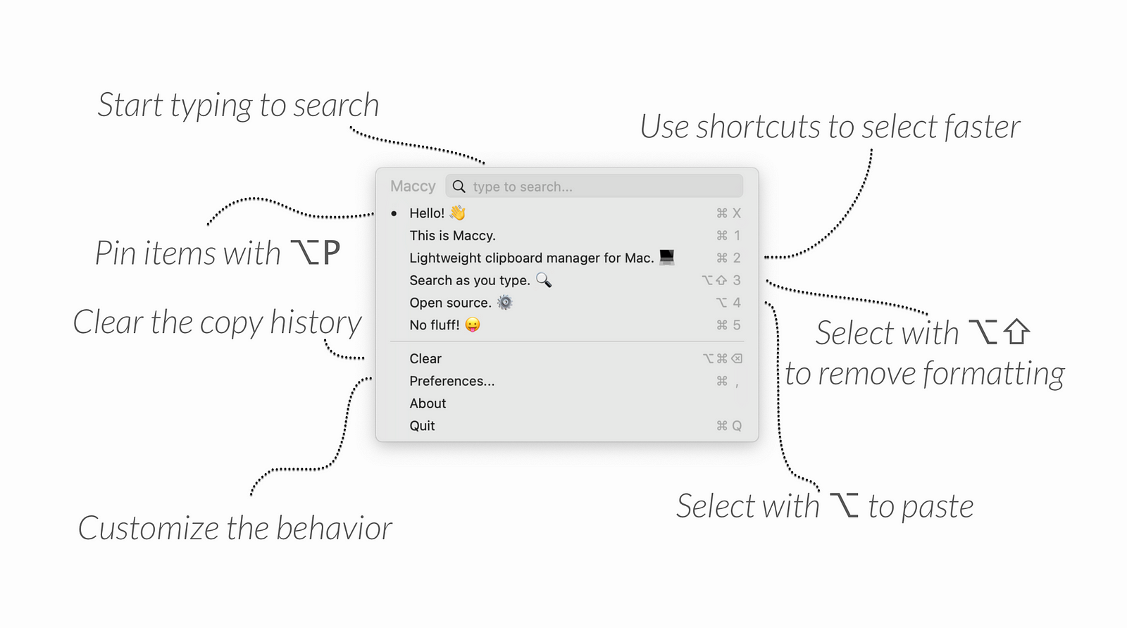 Update: Unfortunately I just learned that Maccy* isn’t free anymore. It used to be free. When I got it, it still was. It’s now $4.99 one-time*. Still a great deal! But not free.