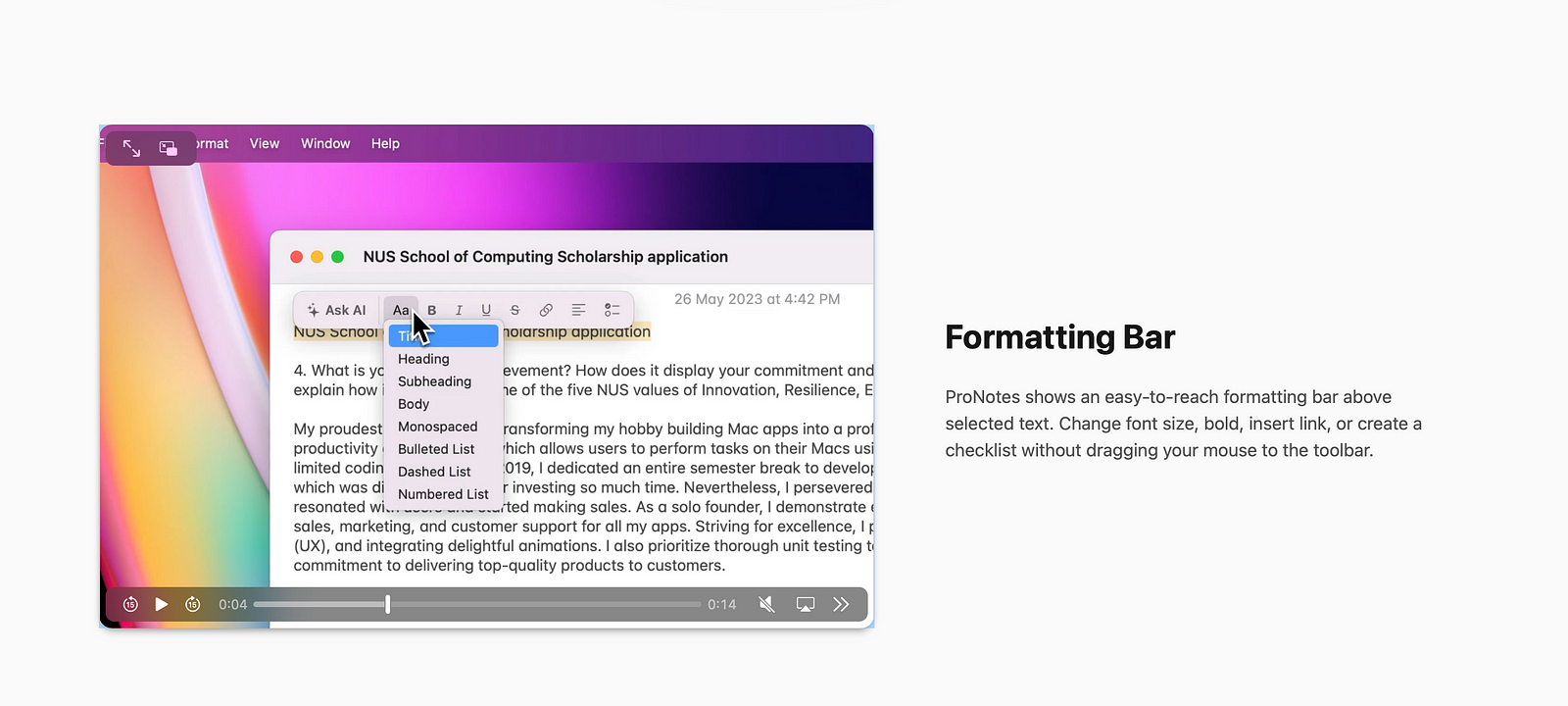 ProNotes give Apple Notes Markdown support for fast and easy formatting, template support which is extremely handy for recurring structure and notes, a cool formatting bar that pops up when you highlight text, and very useful slash commands (you might know those from Notion) to quickly use various functions.