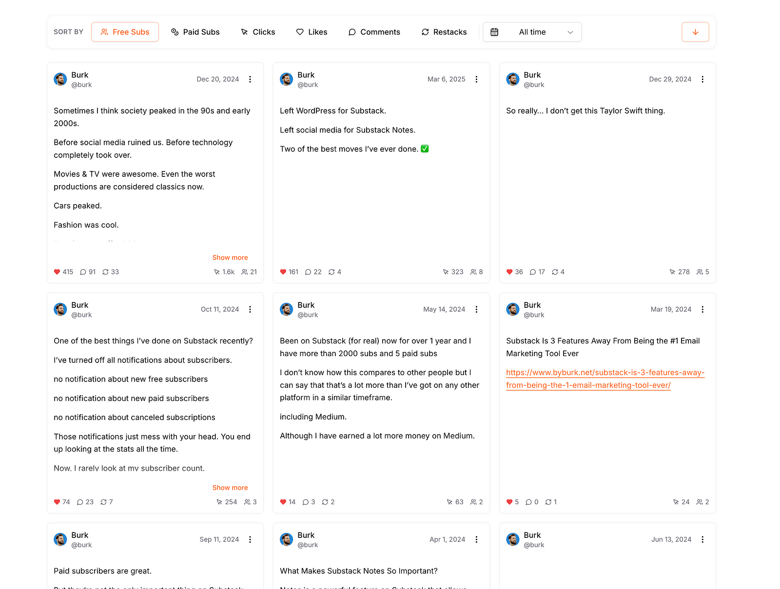 You can break down how your Notes are performing. Based in multiple criteria, like subscribers gained, likes, comments, restacks, and more.