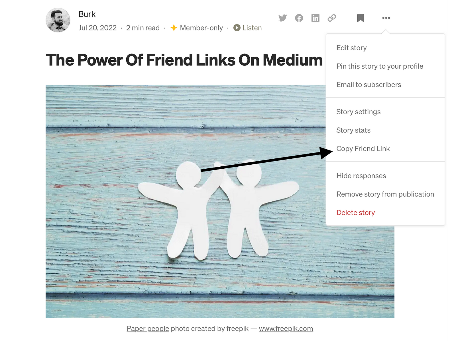 I’ve written about friend links in the past. Every Medium story has a friend link. You’ll find that in the “Story settings” section of your story, or directly under the three-dots menu.
