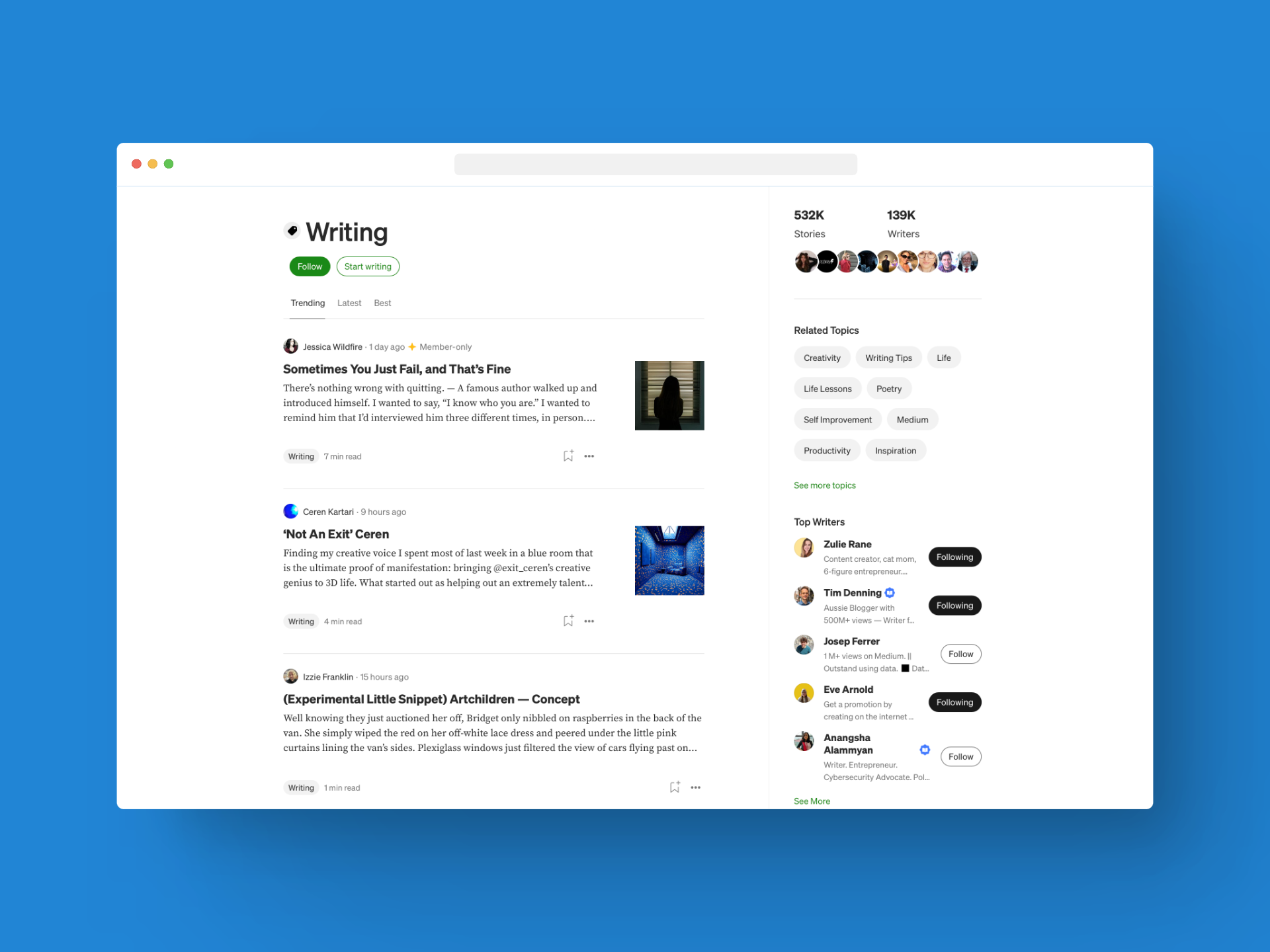 If you’re familiar with Medium, you should know the Topics pages. For each topic (or tag), Medium has its own landing page. See an example for the topic “Writing” below.